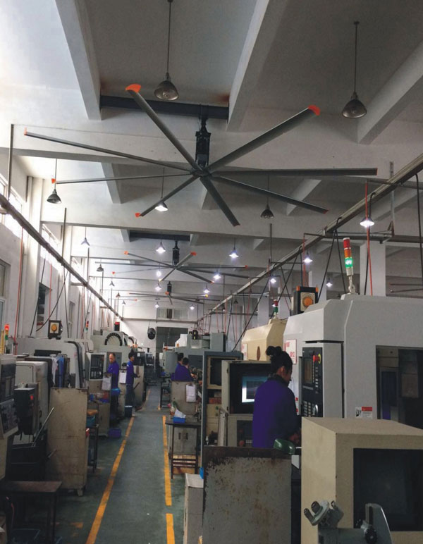我公司生產的大型工業吊扇直接懸掛在廠房屋梁下,風力柔和,能加快車間空氣流通,有效降低車間內溫度,改善車間空氣環境質量,有利于員工的身體健康。